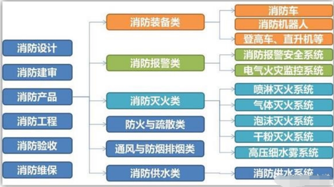 消防產(chǎn)業(yè)鏈中,主要分為消防設(shè)計、消防建審、消防產(chǎn)品、消防工程、消防驗收、消防維保等環(huán)節(jié)。