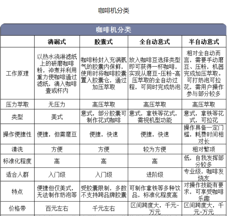 人們把電子技術(shù)應用到咖啡機上,實現(xiàn)了磨粉、壓粉、裝粉、沖泡、清除等釀制咖啡全過程的自動控制,創(chuàng)造了咖啡機。具體分品類來看,咖啡機根據(jù)萃取方式可主要分為滴漏式、膠囊式和壓力式(意式),根據(jù)工作方式可分為全自動和半自動(區(qū)別在于半自動需要消費者掌握一定的咖啡技能,磨豆、壓粉、打奶泡等多項步驟需手動參與)。