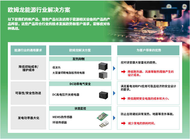 在能源行業(yè)新產(chǎn)品,除上期介紹的G9KA、G7EB、G9KB、G7L-X、G2RG-X、G5PZ-X等6個系列功率繼電器,還有以下產(chǎn)品方案: