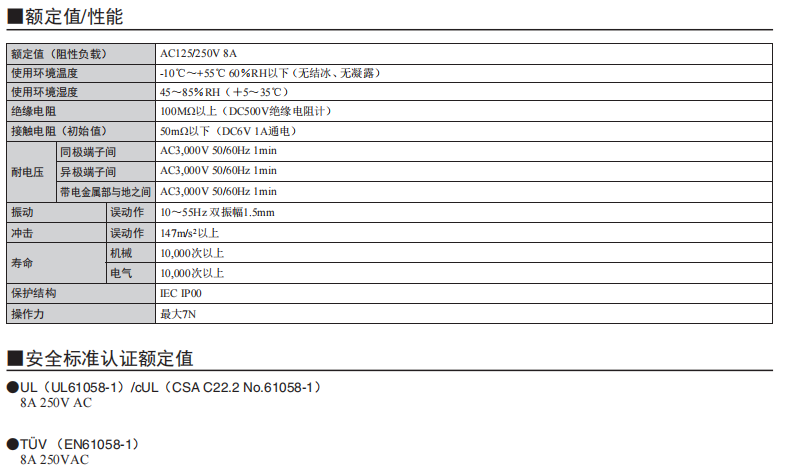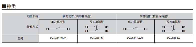 接點間隔3mm以上的小型電源開關 采用特定的速斷機構,可進行功率負載開、閉。開、閉利落、良好的操作感。 確保接點間隔3mm以上。 符合UL、cUL標準、符合EN標準。