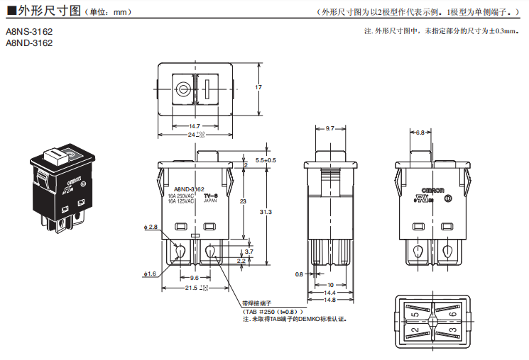 A8M 小型船型開關(guān) 實現(xiàn)16A開關(guān)性能的小型船形開關(guān) 小型、16A的開關(guān)性能。 可進行一觸式安裝。 符合UL、cUL認(rèn)證,EN標(biāo)準(zhǔn)適用品。