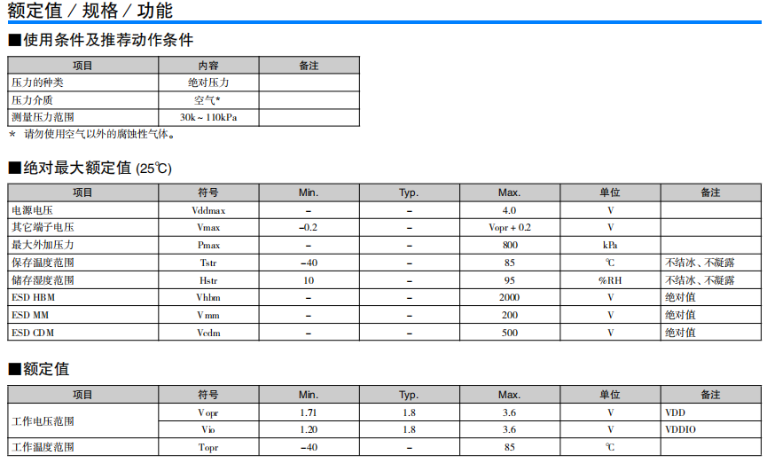 高精度·低消耗電流的小型MEMS絕對壓力傳感器 高精度地測量氣壓 內置低干擾的24bit ADC 基于I2C/SPI 接口的數字控制/輸出 在自動睡眠模式下實現低消耗電流 單獨的補償系數保存在OTP*中 (* One Time Programmable - ROM)